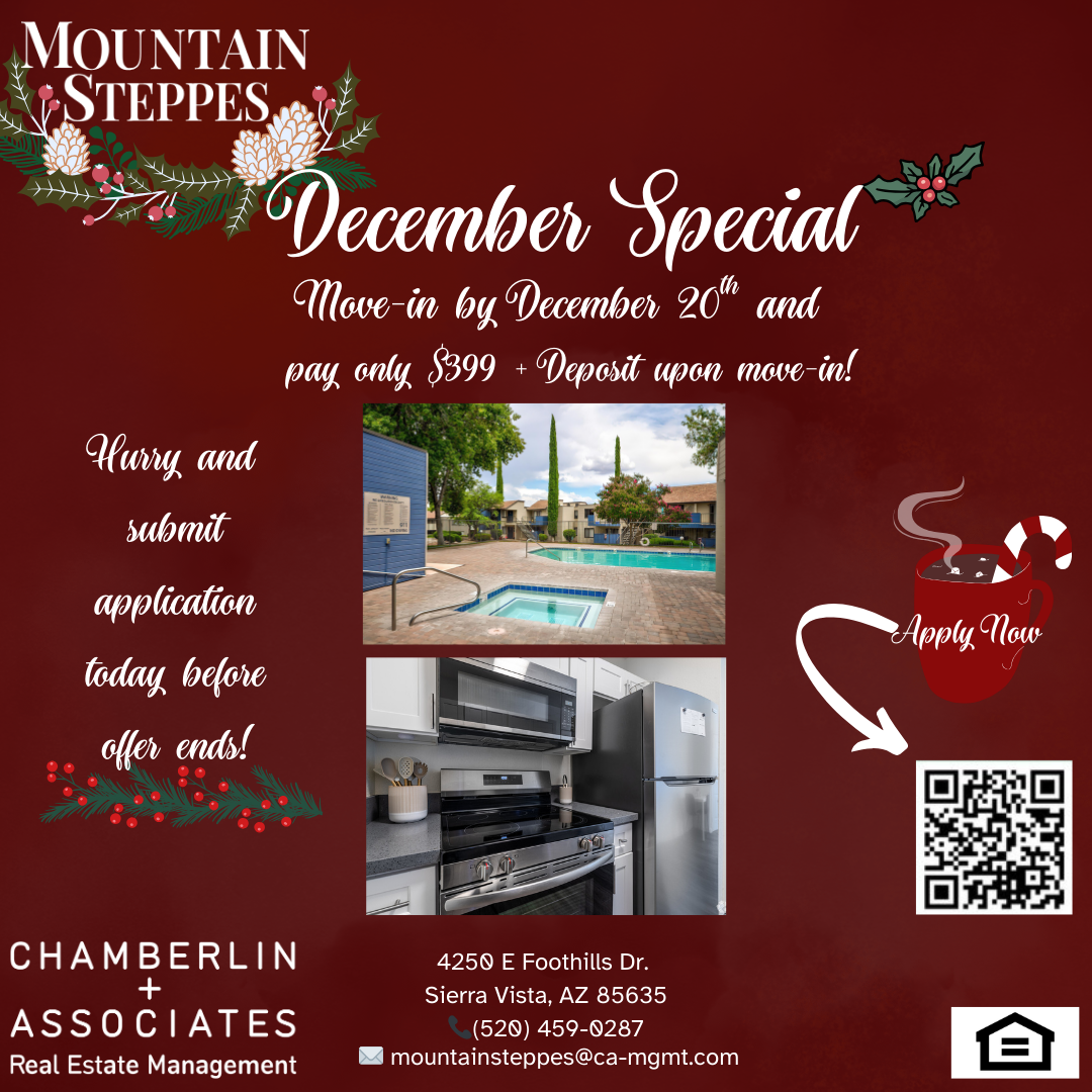 Celebrate this Holiday season with extra savings! πβ¨ Move in by December 20th and enjoy a total move-in cost of just $399!Specials